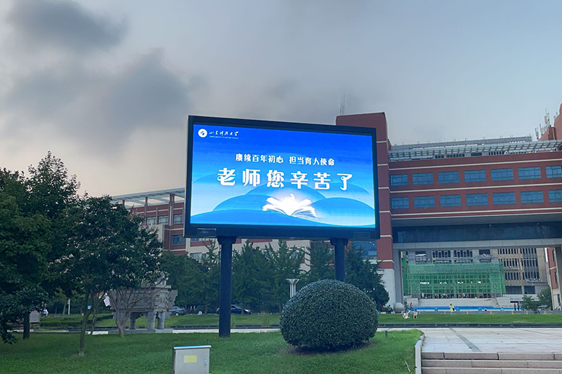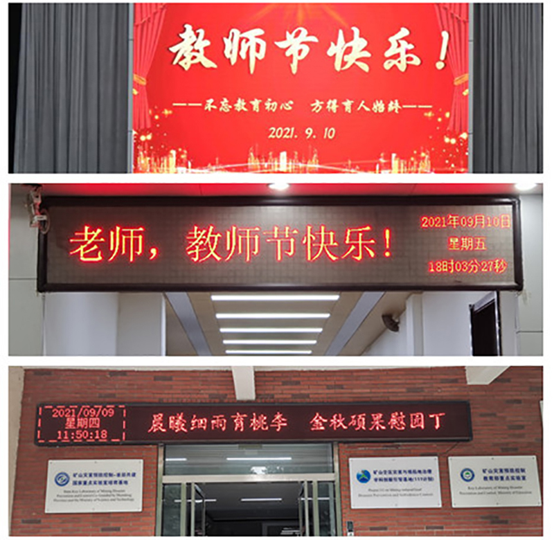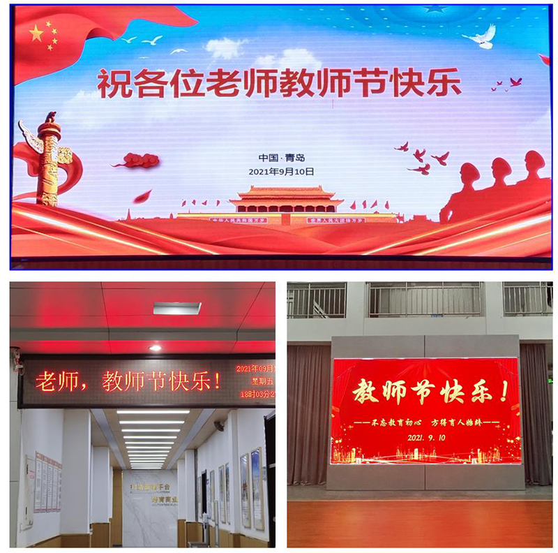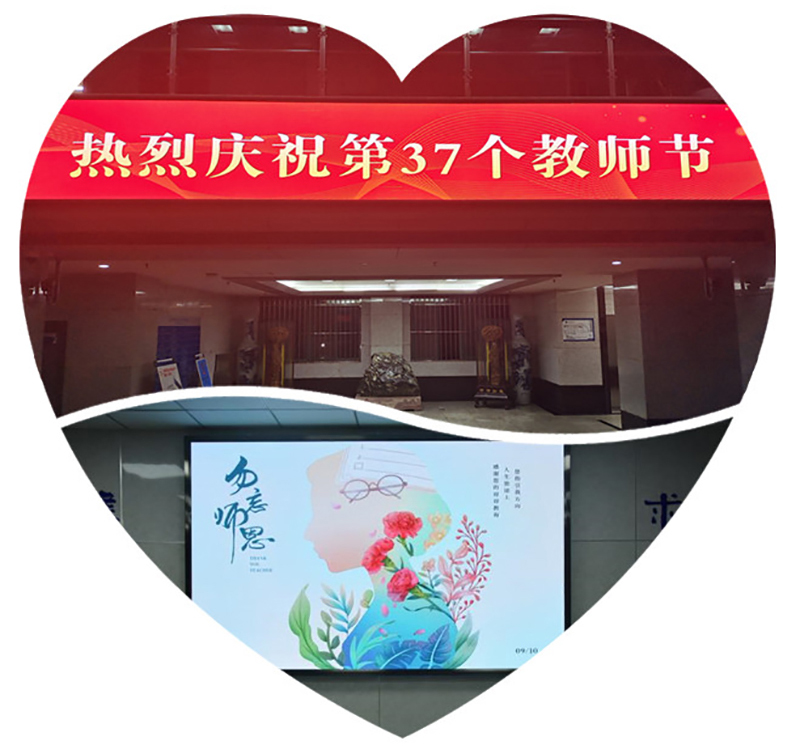 校园里,各办公楼、教学楼、学生公寓、餐厅、室外广场等所有场所的LED屏、电视等媒介,以字幕滚动或电子海报方式为教师亮灯。