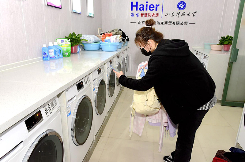 Ky开元集团建“智慧洗衣房”,学生可扫码洗衣。(任波/摄)