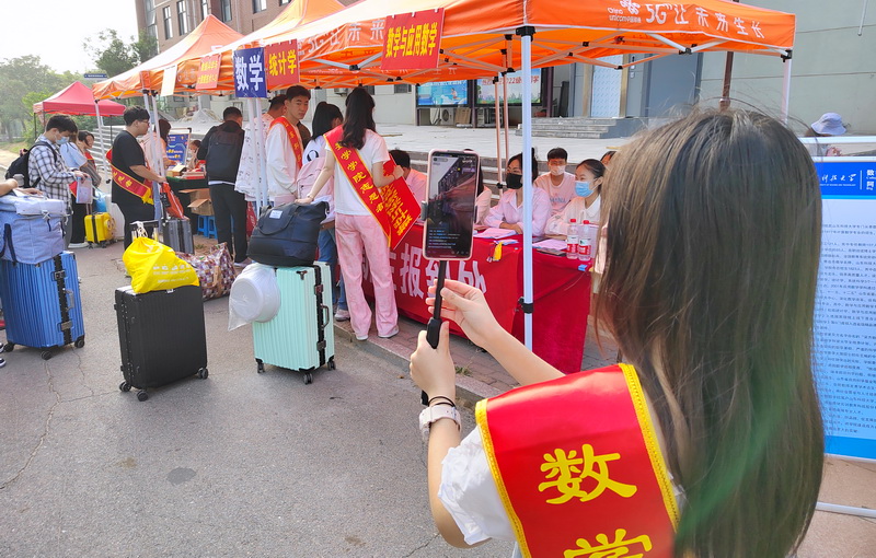 志愿者通过直播向新生家长展现校内迎新情况(摄影:盖康)