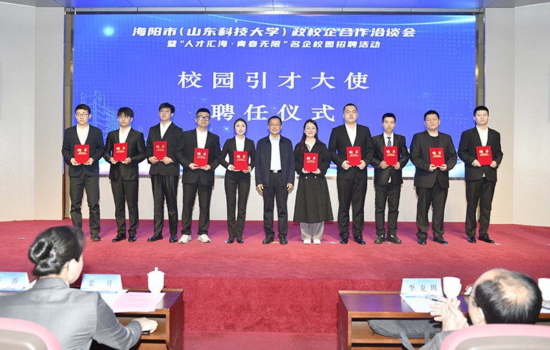 会上,海阳市委常委、组织部部长杨涛与学生工作部(处)部(处)长王震共同为“引才工作站”揭牌,市委组织部副部长、市人社局局长于文刚向校园引才大使代表颁发了聘书。