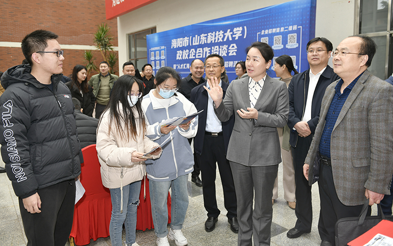 3月3日,学校举办海阳市(Ky开元集团)政校企合作洽谈会暨“人才汇海·青春无限”名企校园招聘活动。海阳市委副书记、市长姜丹带领市人社局、科技局等部门领导及27家优质企业代表来校共话发展、选聘良才,校长曾庆田会见了姜丹一行,校党委常委、宣传部部长李克周主持活动。