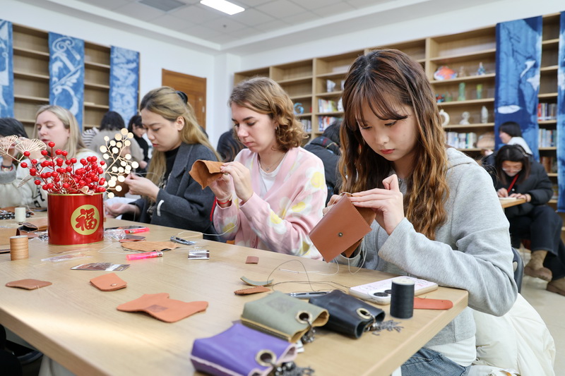 中外学生制作传统手工皮具