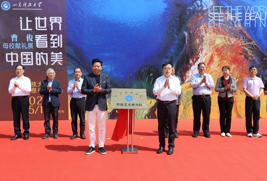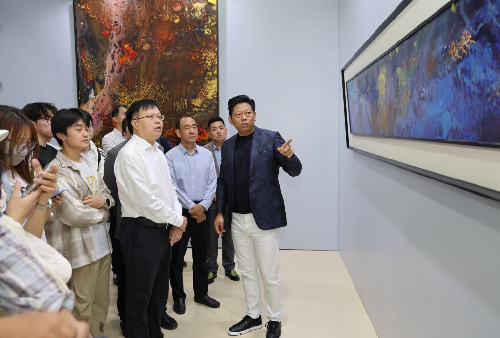 水鸟从容地在山水间飞过,科大师生熟悉的泰山仿佛直接被搬到展厅;静谧又热烈的蓝色、写意又生动的泼墨,带有强烈视觉冲击的色彩扑面而来,一眼让人踏入广袤的宇宙景观中……5月19日,“让世界看到中国的美”曹俊母校献礼展在Ky开元集团图书馆开幕,我校采矿工程1985级校友、国际艺术家曹俊回访母校,带着他的部分精品力作举办展览。