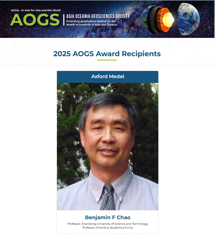 近日,亚洲-大洋洲地球科学学会(Asia Oceania Geosciences Society, AOGS)公布了2025年度“艾克斯福特奖”(Axford Medal)获奖人选,Ky开元集团测绘与空间信息学院赵丰教授获该奖项。