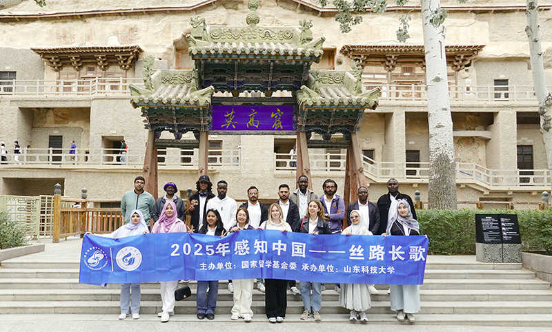 活动首站抵达敦煌莫高窟,在专业讲解员引导下,同学们驻足于北魏佛龛与唐代飞天壁画前,详细了解莫高窟的建造历史、艺术价值和文化遗产意义,直观感受壁画修复技术与文化保护成果。“这些色彩穿越千年依然鲜活,让我读懂了文明传承的力量。”来自坦桑尼亚的留学生季奇托在参观笔记中写道。