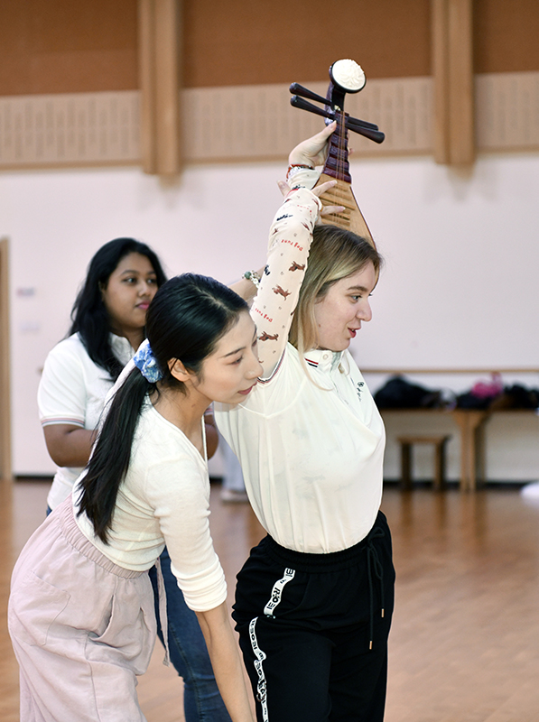 俄罗斯留学生张瑶在老师指导下练习敦煌乐舞中经典动作“反弹琵琶”