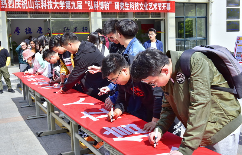 研究生在条幅上签名