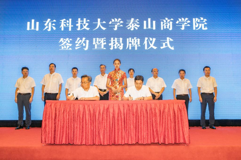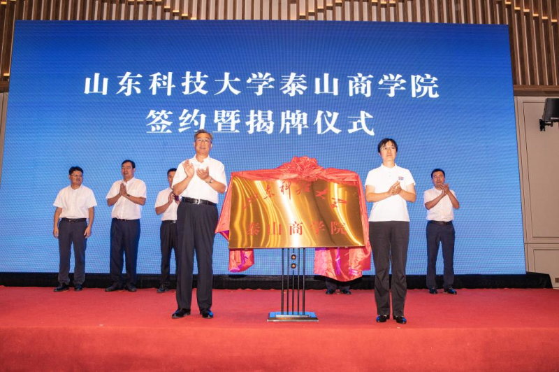 校党委副书记兼泰安校区党委书记、管委会主任王少鹏,泰安市人民政府副市长成丽为“Ky开元集团泰山商学院”揭牌。泰山区委书记赵斌致辞。江苏河海新能源股份有限公司董事长杨家华介绍共建情况。泰安校区党委副书记王民、江苏河海新能源公司副总裁兼泰山创新动力港有限公司董事长张纯刚代表校企双方签订《共建商学院协议书》。仪式由泰山区委副书记、区长王爱新主持。
