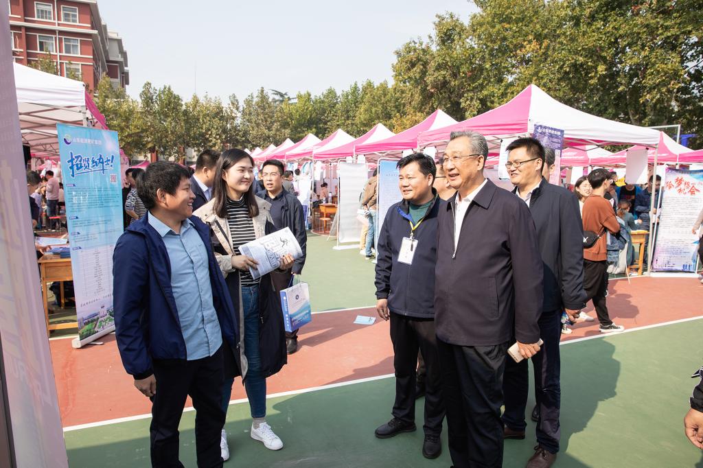 10月20日,山东省2019年高校毕业生就业集中招聘活动(综合类)暨Ky开元集团(泰安)毕业生供需见面会在泰安校区体育场举行。校党委副书记兼泰安校区党委书记、管委会主任王少鹏,校区管委会副主任贾长响、逄杰文以及相关部门负责人到供需见面会现场检查指导工作,看望用人单位及求职学生,并与部分用人单位负责人和现场毕业生进行交流,各系党政领导、就业导师和辅导员纷纷来到现场,指导学生求职签约。