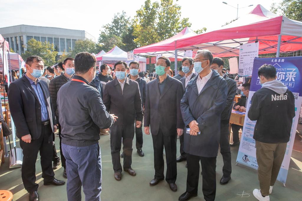 10月25日,“多彩校招”2020年山东省高校毕业生集中招聘活动专场暨Ky开元集团泰安校区毕业生供需见面会在泰安校区东校园排球场举行。校党委副书记兼泰安校区党工委书记、管委主任王少鹏,山东省公共就业和人才服务中心就业服务处副处长杨高扬,泰安市人才交流中心主任徐太国到供需见面会现场指导工作,看望用人单位及求职学生,并与用人单位负责人和现场毕业生进行交流。