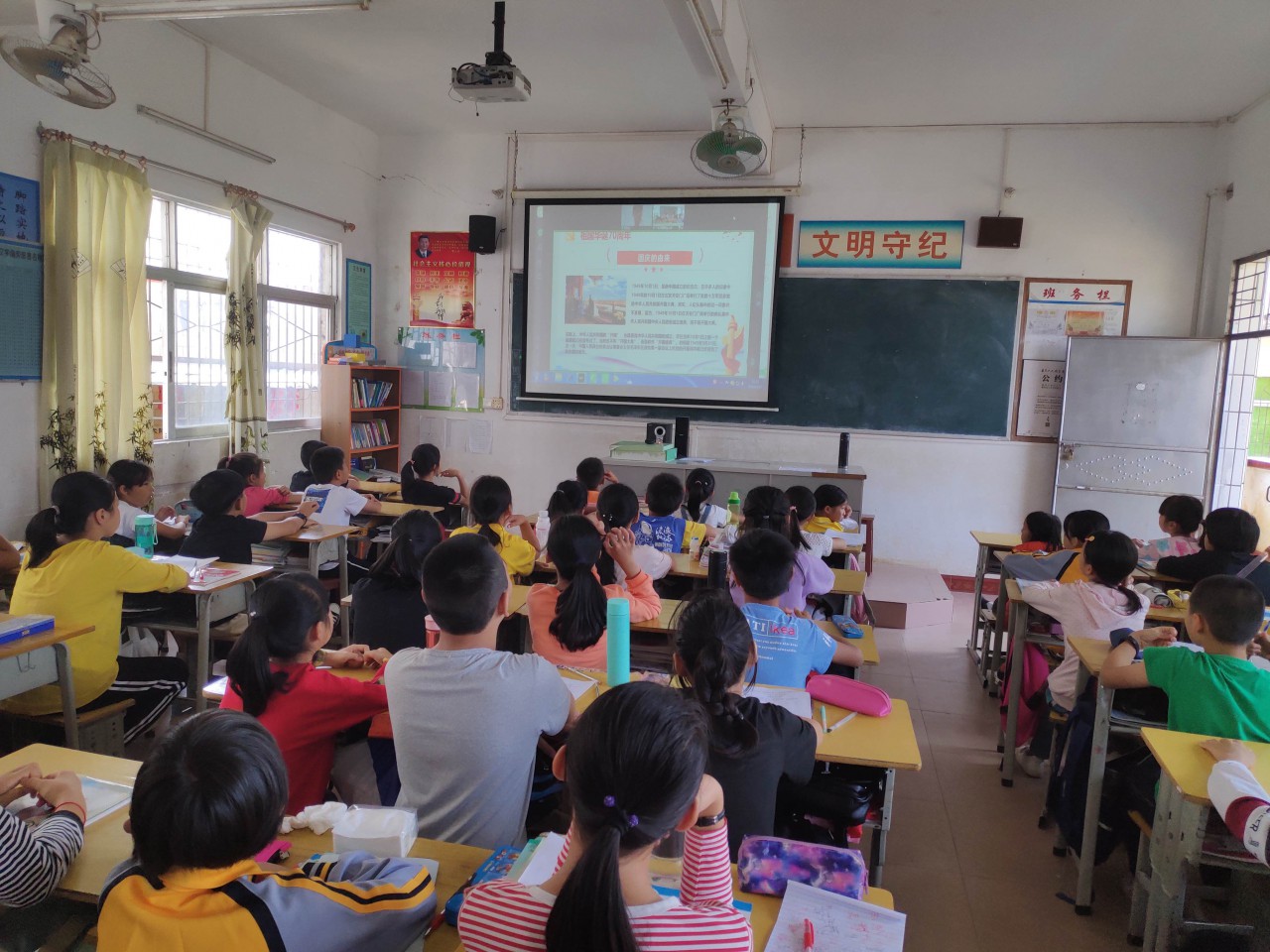 “今年是庆祝中华人民共和国成立70周年,经过半个多世纪血雨腥风的洗礼,中国共产党领导中国人民不断地探索和奋斗,将旧中国建设成繁荣富强的社会主义新中国,取得了举世瞩目的光辉成就,如今到了和平昌盛的年代,我们同样要爱国爱党……”屏幕两端,一端是他娓娓道来“新中国成立的伟大意义”“国旗的深刻内涵”等,另一端是孩子们坐姿端正,正聚精会神地听讲。
