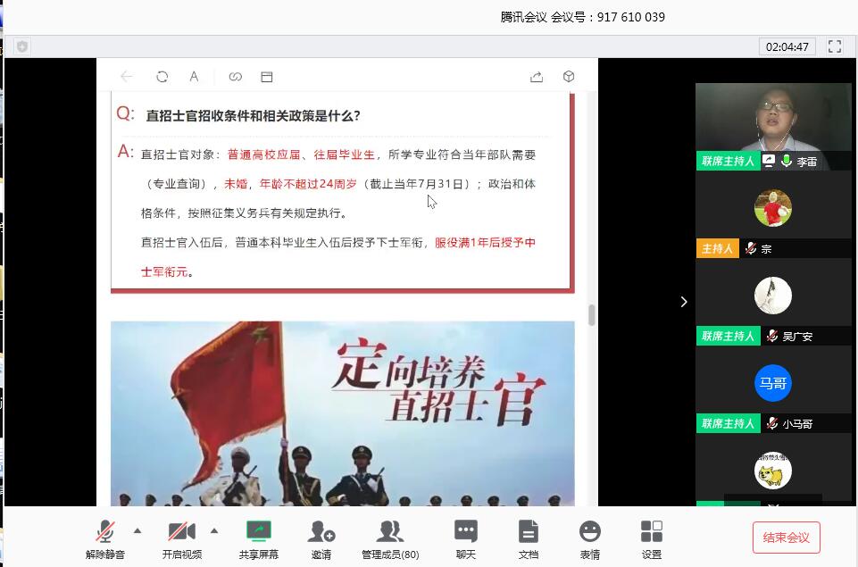 以创新续航,用好新媒体征兵宣传新引擎。学校搭建征兵工作联络员、退役士兵与在校学生的线上互动交流平台,利用“两微一群”即“山科大官微”“科大军鹰”“微信公众号”“2020山科大征兵咨询QQ群”开展线上宣传、咨询工作,累计推送征兵宣传相关文章20余篇,线上累计解答学生问题500余个。打造“圆梦小屋”征兵直播微课堂,以《青春筑梦新时代,携笔从戎报家国》,举办网络征兵访谈活动,发布《大学生参军入伍十问》,推送军种特色宣传推文,《参军报国,无上光荣》征兵宣传片、《大学生参军入伍问题答疑》系列小视频在校园电视、校园网等平台展播,将“关心国防、情系军队、矢志报国、依法服役”的浓厚氛围通过互联网传递到身在家中的每位同学。