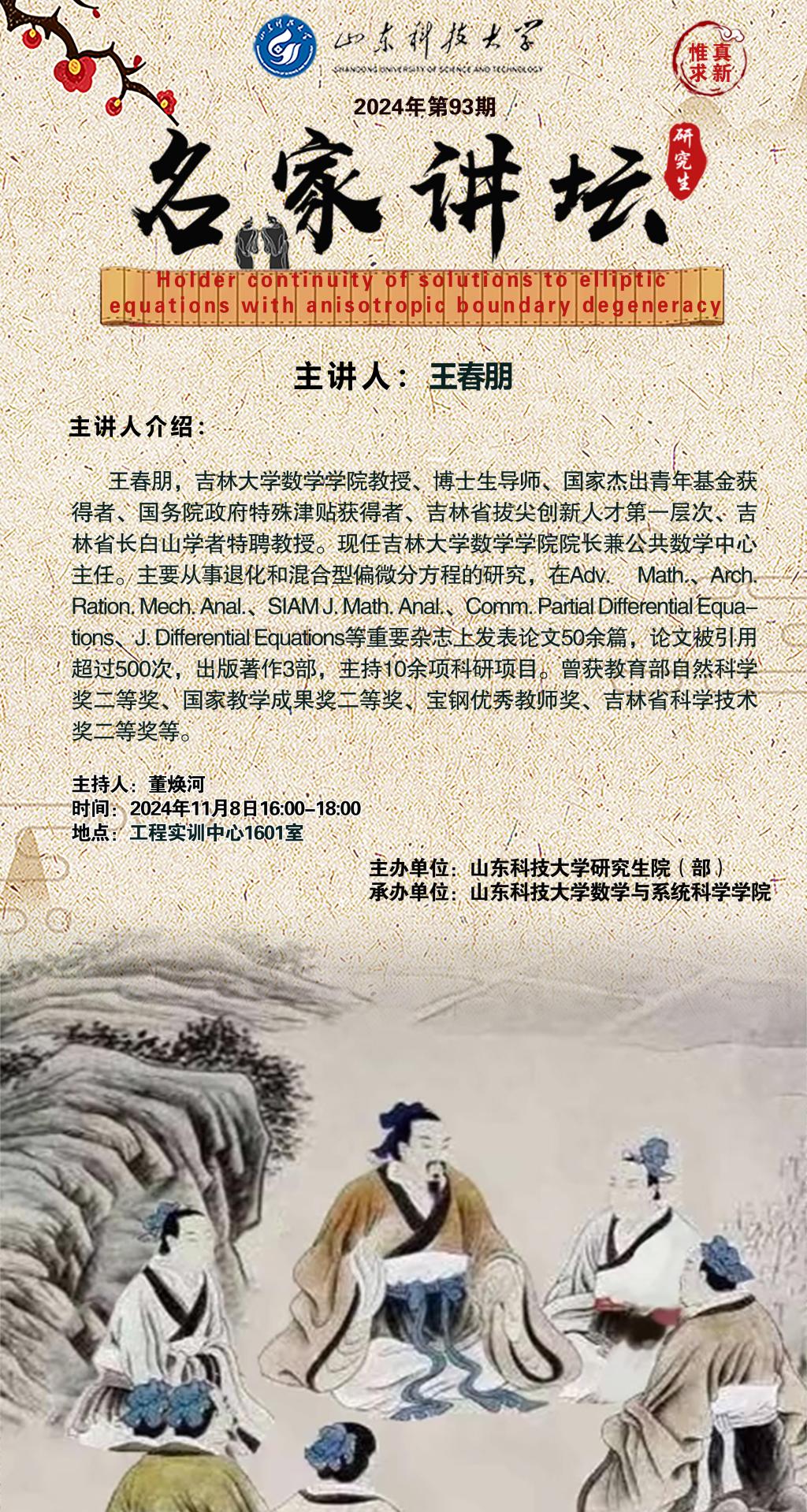 “名家讲坛”2024年第93期:Holider continuity of solutions to eliptic equations with anisotropic boundary degeneracy(总987期)
