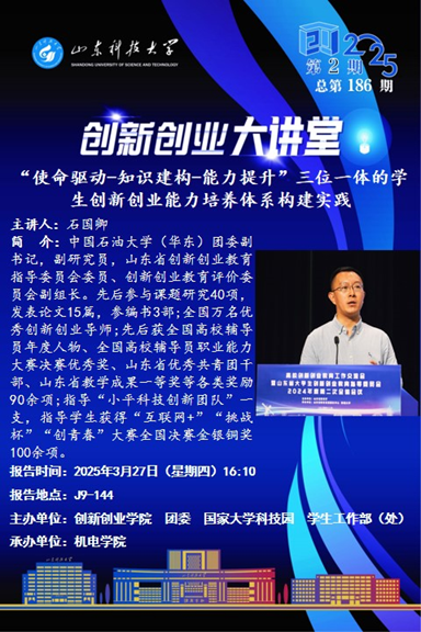 创新创业大讲堂2025年第2期(总第186期)“使命驱动-知识建构-能力提升”三位一体的学生创新创业能力培养体系构建实践