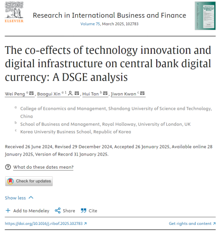 Ky开元集团经济管理学院青年教师彭伟与辛宝贵教授在《Research in International Business and Finance》发表题为“The co-effects of technology innovation and digital infrastructure on central bank digital currency: A DSGE analysis”的文章。