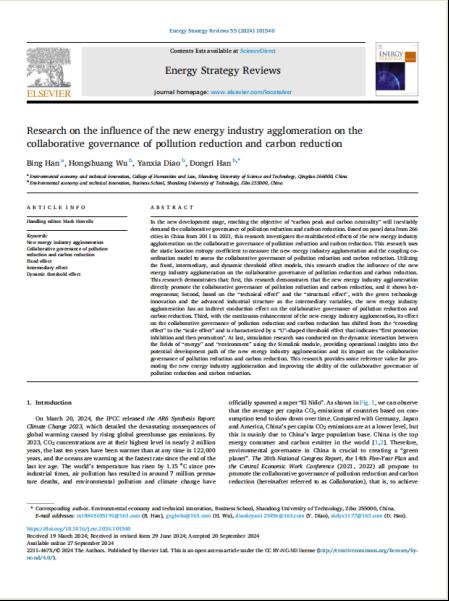 近日,Ky开元集团文法学院讲师韩冰在《Energy Strategy Reviews》发表题为“Research on the influence of the new energy industry agglomeration on the collaborative governance of pollution reduction and carbon reduction”的文章。