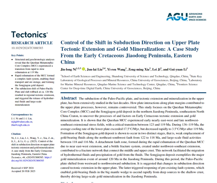 2025年3月,Ky开元集团地球科学与工程学院倪金龙教授团队在国际构造地质学知名期刊、美国地球物理学会(AGU)会刊《Tectonics》发表题为“Control of the Shift in Subduction Direction on Upper Plate Tectonic Extension and Gold Mineralization: A Case Study From the Early Cretaceous Jiaodong Peninsula, Eastern China”的文章。