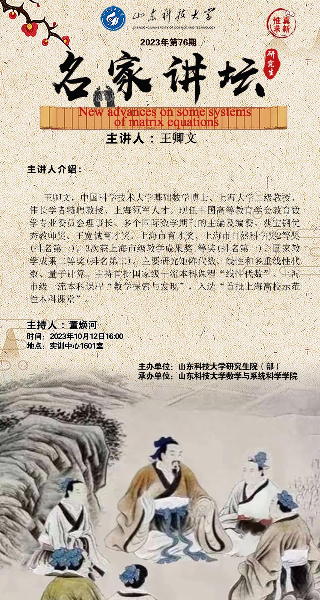 “名家讲坛”2023年第76期:New advances on some systems of matrix equations(总877期)