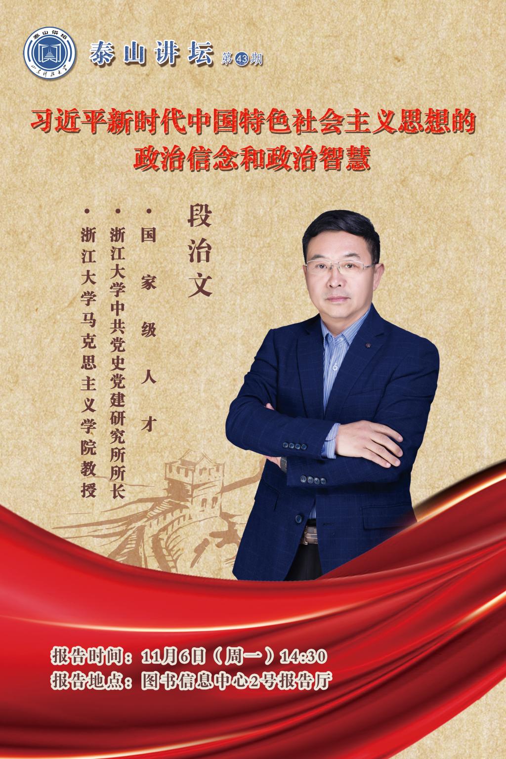为深入学习贯彻党的二十大精神,进一步巩固深化主题教育成果,学校拟举办第43期“泰山讲坛”。特邀国家级人才,浙江大学中共党史党建研究所所长,马克思主义学院教授、博士生导师段治文作专题报告。现将有关事项通知如下。
