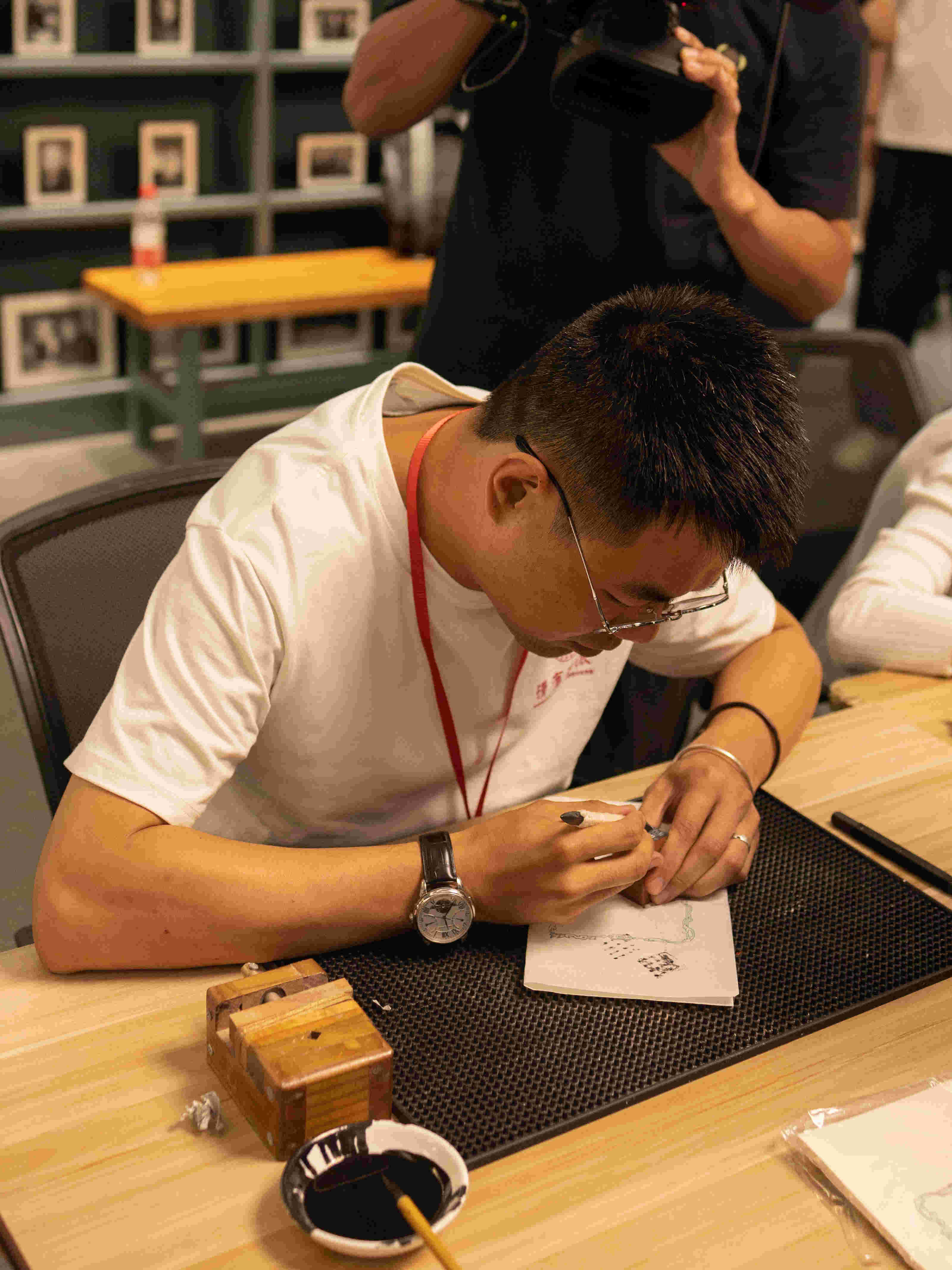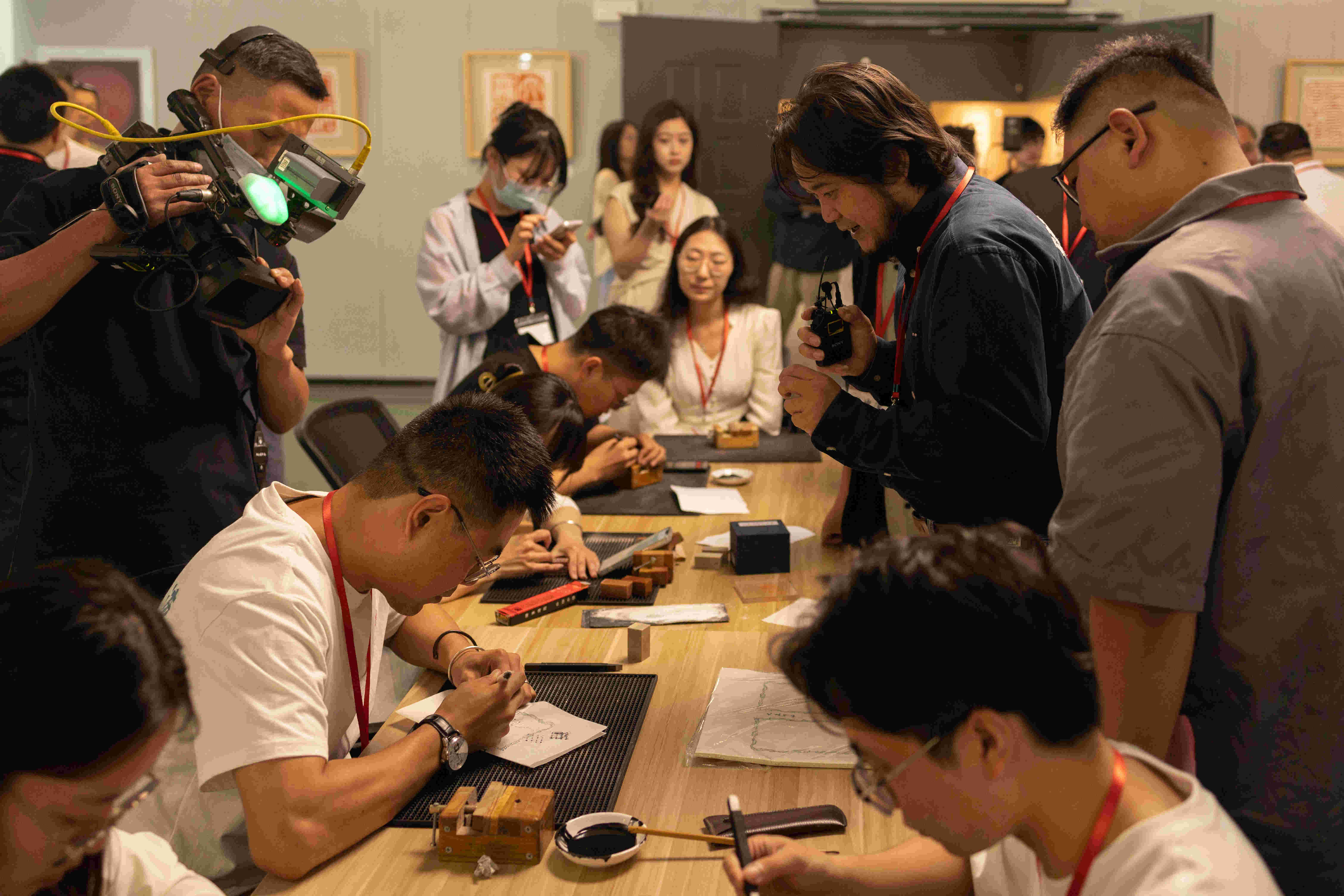 活动的另一大看点是现场篆刻演示。在场馆中央摆放着一张书案,六位同学排开而坐,他们在现场向观众展示着篆刻创作的全过程。只见他们在砂纸上打磨好石头,或用刀、或用毛笔在石头上打稿。