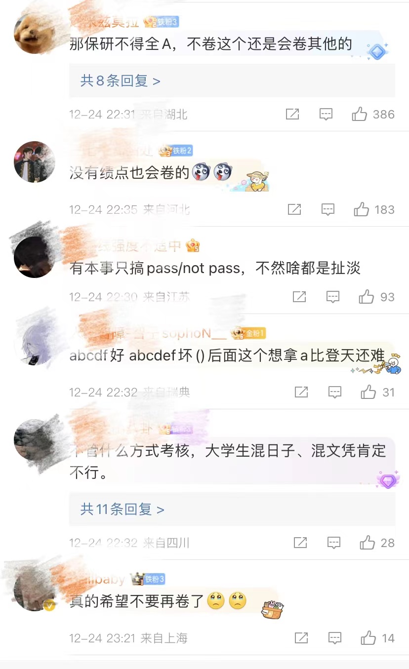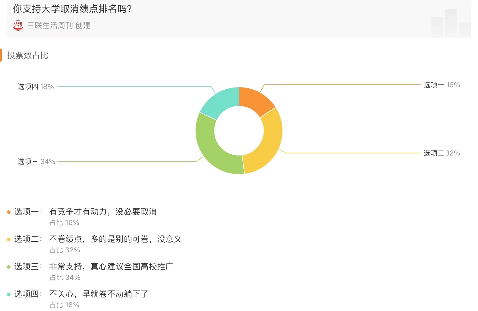 正在进行的一项微博话题“是否支持大学取消绩点排名”的投票中,16%的网友认为“有竞争才有动力,没必要取消”,32%网友认为“不卷绩点,多的是别的可卷,没意义”,34%的网友表示“非常支持,真心建议全国高校推广”。